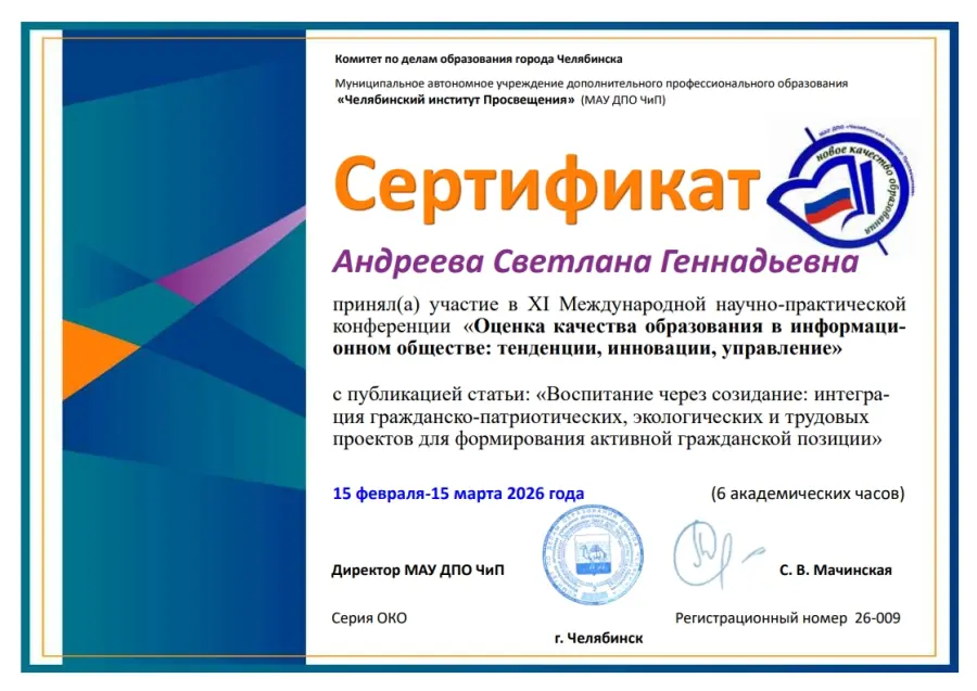 🔹 Андреева Светлана Геннадьевна, директор, представила статью «Воспитание через созидание: интеграция гражданско-патриотических, экологических и трудовых проектов для формирования активной гражданской позиции».