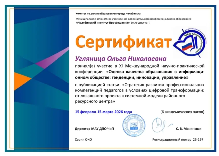 🔹 Угляница Ольга Николаевна, заместитель директора по учебной работе, представила статью «Стратегия развития профессиональных компетенций педагогов в условиях цифровой трансформации: от локального проекта к системной модели районного ресурсного центра».