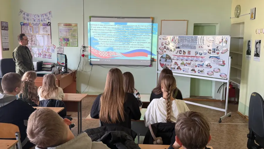 4 апреля 2026 в рамках шестого дня гражданского и патриотического, духовно-нравственного воспитания с учащимися 7-8 классов проводилась диалоговая площадка «Две сестры - Беларусь и Россия» ко Дню единения. Учащиеся ознакомились с историей Союзного государства, национальной символикой Беларуси и России, традициями стран, общими особенностями культуры.