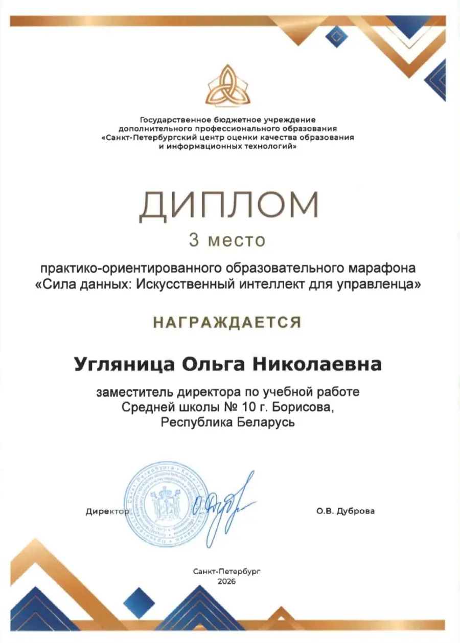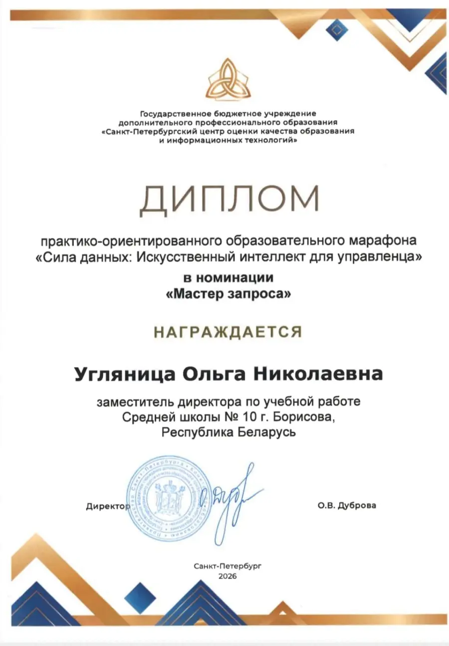 На конференции подводили итоги всероссийского марафона «Сила данных: ИИ для управленца». Среди победителей - Ольга Николаевна Угляница, заместитель директора по учебной работе.