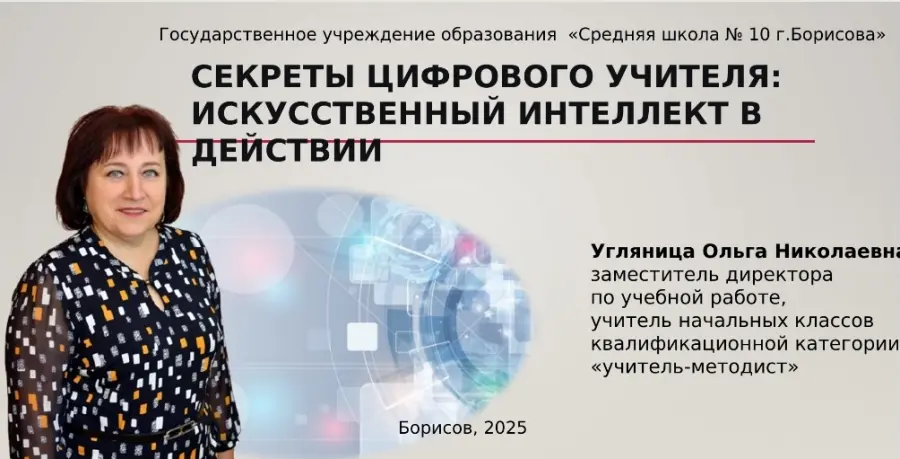 26 ноября 2025 года в Государственном учреждении образования «Академия образования» состоялась онлайн‑конференция в формате Zoom. Спикером выступила победитель республиканского конкурса методических разработок с использованием технологий искусственного интеллекта — заместитель директора по учебной работе ГУО «Средняя школа №10 г. Борисова», учитель‑методист Угляница Ольга Николаевна.