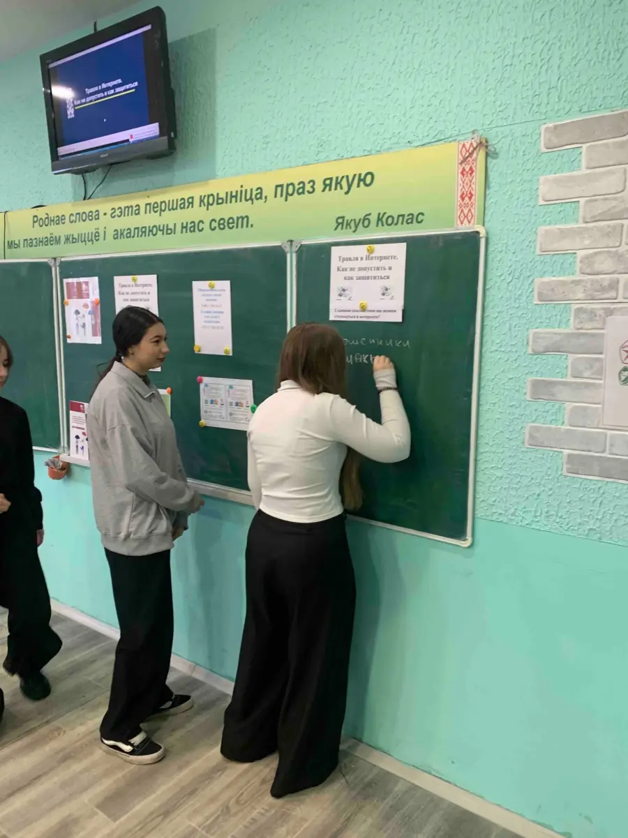 В рамках республиканского инновационного проекта «Внедрение модели формирования культуры здорового образа жизни, социально безопасного и ответственного поведения учащихся в современном образовательном пространстве» и мероприятий Недели кибербезопасности 27.11.2025 в 8 "А" классе с использованием видеоролика проведено занятие-тренинг «Травля в Интернете. Как не допустить и как защититься».